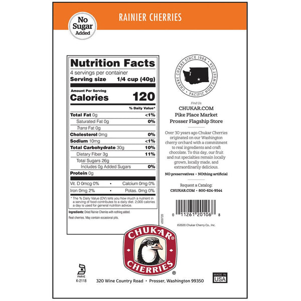 Naturally honey-sweet and nutritious, Rainier cherries are a specialty fruit from the Pacific Northwest. Shelf Life: 18 months Bag: Stands upright. Resealable. 4 7/8" x 7 3/8" x 2 3/8". 12 Units/Case. Nothing Artificial: No preservatives, No sugar, No sulfites Family owned for over 35 years. We manufacture most everything we sell at our headquarters in Prosser, Washington using local fruits & clean ingredients.