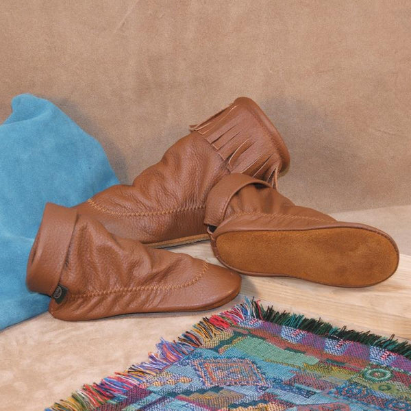 Children love these Teepee Boots because they are comfortable and fun to wear! In Creme or Saddle deertan leather, our exclusive pull-on pattern has leather-covered Poron cushion insoles and cowhide suede soles.