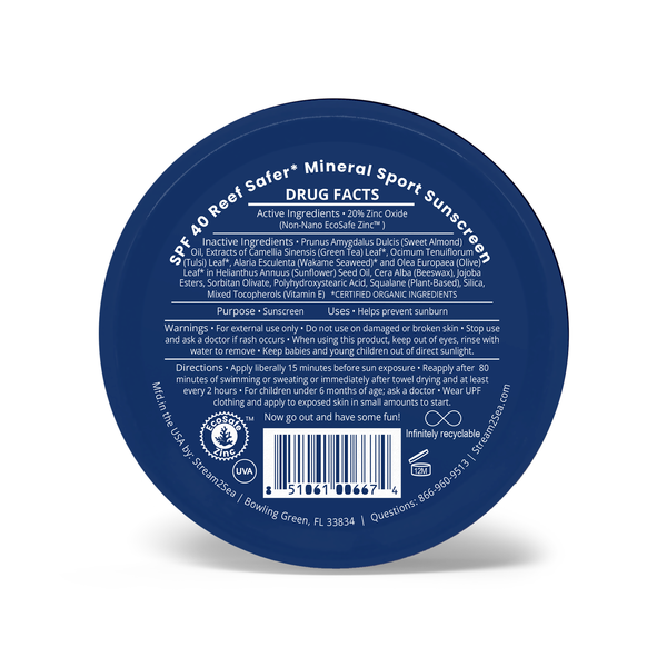 Provides a top-tier sun protection with our SPF 40 Sport Sunscreen Zinc Balm. Formulated with 20% EcoSafe Zinc™, this non-nano mineral sunscreen offers powerful, broad-spectrum protection against UVA and UVB rays while applying sheer for a smooth, comfortable finish. With just nine simple ingredients plus our proprietary antioxidant blend, this balm is ideal for active, outdoor use. It delivers an added layer of protection while being gentle on sensitive skin and kind to our oceans. Features: ✔️ Eco-Conscious & Safe: Verified by the Environmental Working Group (EWG) and certified 100% U.S. Department of Agriculture Biobased, ensuring safe and responsible sun care. ✔️ Reef-Safe Formula: Made with EcoSafe Zinc™, proven safe for coral reefs, marine life, and your customers’ skin. ✔️ Non-Nano Mineral Sunscreen: Applies sheer, without leaving a white cast, making it perfect for everyday outdoor activities.