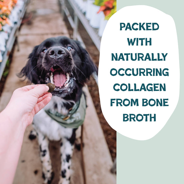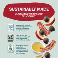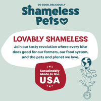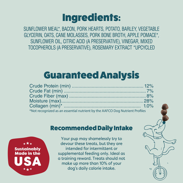 When you’re rewarding your pup big, bacon just hits different. Our bone broth chews contain naturally occurring collagen for a health boost, plus all the flavor to keep those tails wagging. Maybe you can teach an old dog new tricks with these craveable bacon & apple chews. Size: 8 oz Flavor Profile: Bacon, Pork Bone Broth & Apple Health Benefit: Naturally Occurring Collagen, 3 kcal/treats Attributes: Made in the USA Corn Free, Soy Free, All Natural, Upcycled, Sustainable 2023 Collagen Product of the Year @ Independent Pet Innovation Award Program. By Shamelss Pets.