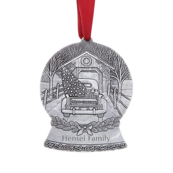 Celebrate the warmth and nostalgia of coming home for the holidays with our enchanting Snowy Homecoming Ornament. This unique, snow globe-shaped ornament features a heartwarming scene of a vintage truck journeying through a covered bridge amidst a winter wonderland.