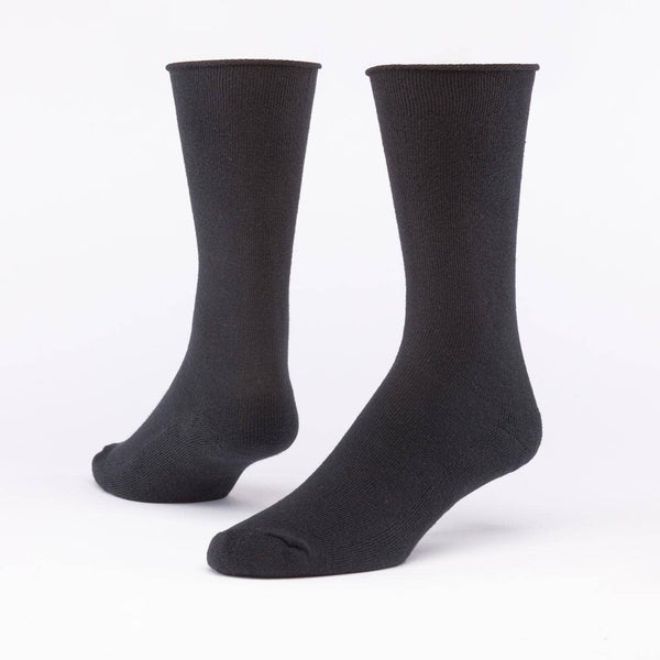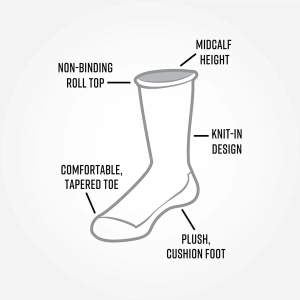 Our mid-calf organic cotton cushion crew socks bring comfort to your day with a non-binding roll top, gentle snugness, comfortable tapered toe, and a soft-cushiony foot-bed.
