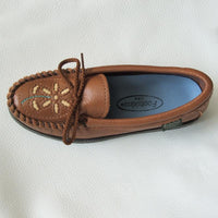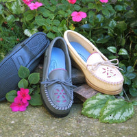For a unique and comfortable shoe, try our Women's Flower Toe style. The decorative floral designs are inset with contrasting leather with hand-stitched detailing. We use a double layer of soft leather on the uppers and flexible, slip-resistant TPR rubber soles. As with all of our footwear, this style can be resoled at a shoe repair shop. Contoured SorboAir® insoles add extra comfort to this style. Available in both deerskin and deertan leathers.