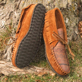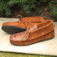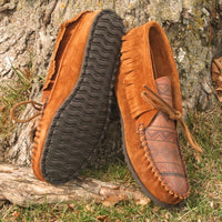 This suede ankle-high moccasin has a fringe cuff around the top and leather lace that ties securely around the ankle. Leather-covered Poron cushion insoles provide comfort. This style is made in Saddle suede with the Aztec patterned leather in the tongue. The light weight flexible Cushion-Flex rubber soles are for both indoor and outdoor wear.